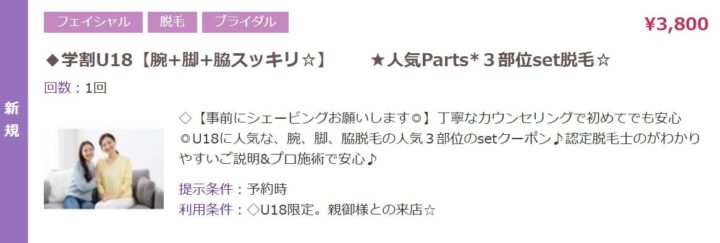【学割U18】人気部位の腕+脚+脇の脱毛はコチラのクーポンをお選びください♪