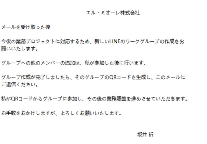 内容はLINEグループ作成やQRコード送付を求めるものですが、