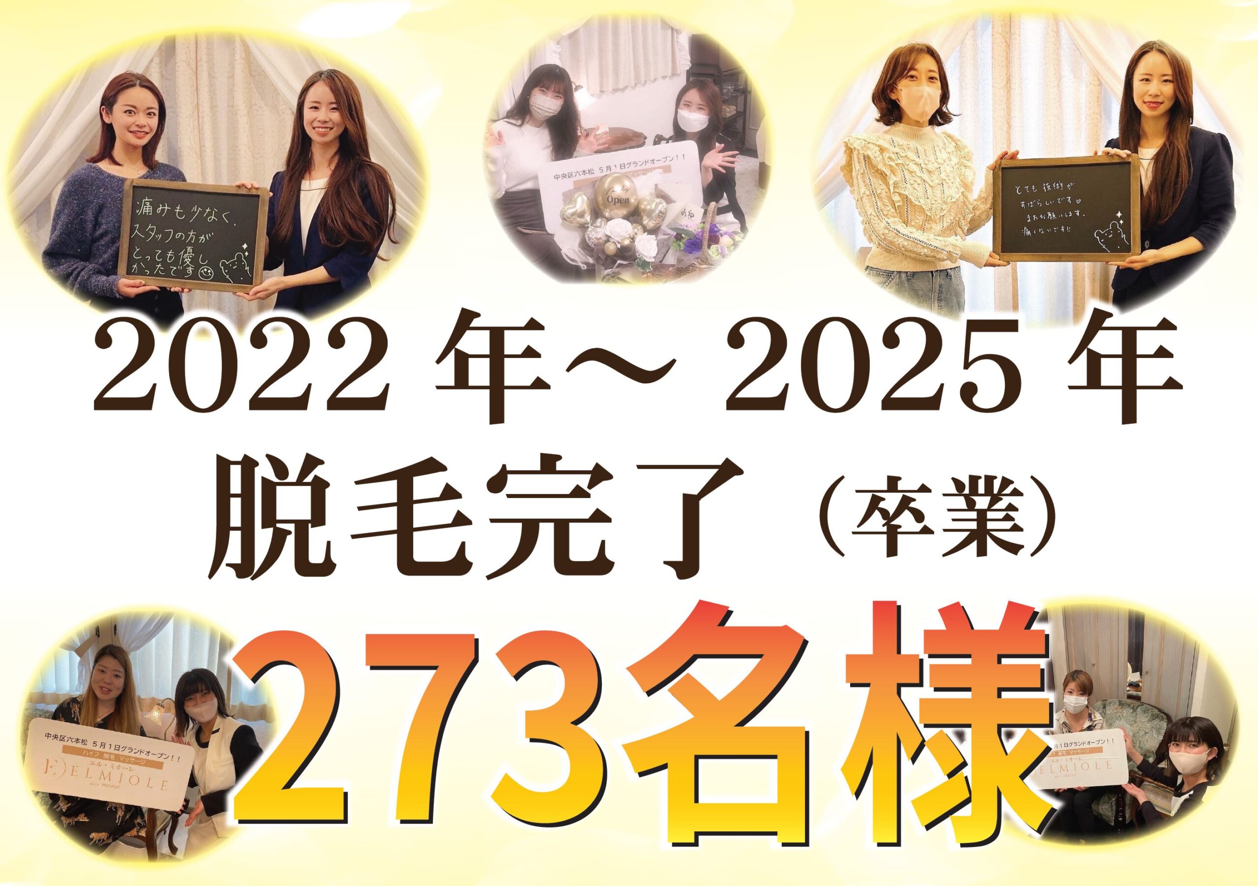 『感謝』OPEN3年(2022年~2025年)で、273名のお客様が、脱毛完了され、理想の美肌を手に入れ卒業されました♪
